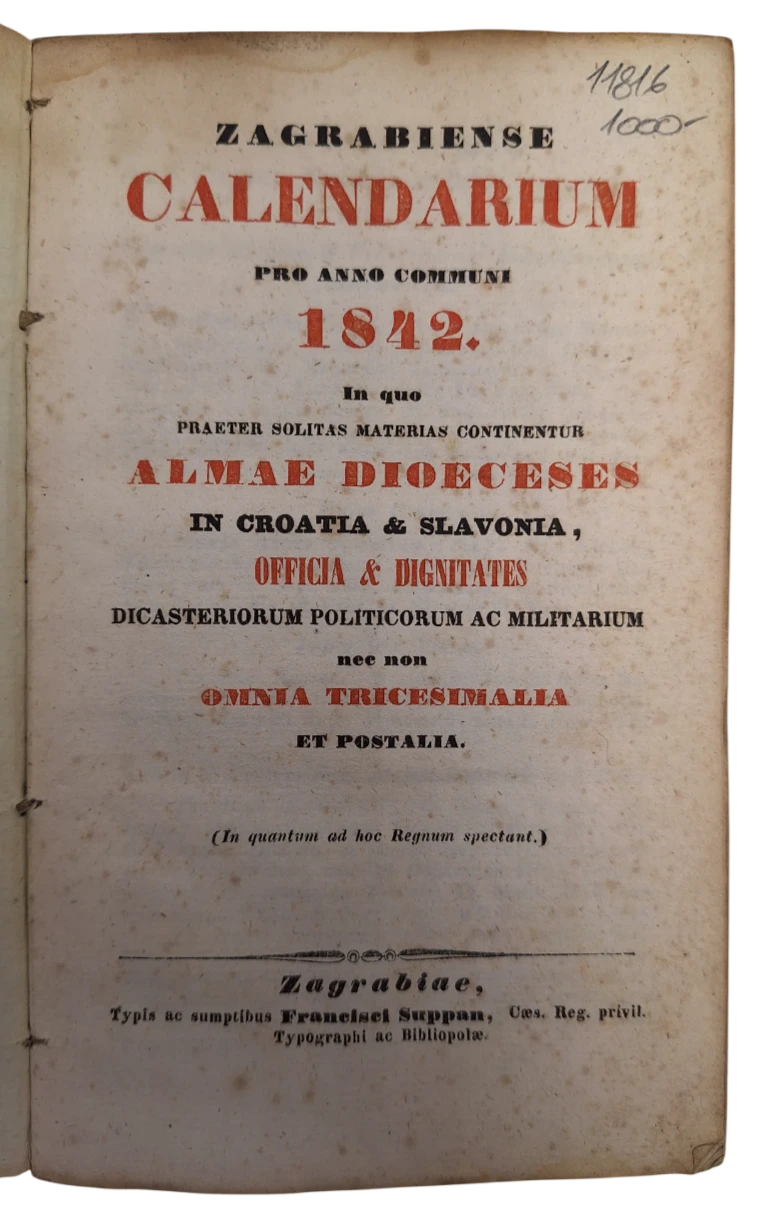 Rijetko godišnje izdanje zagrebačkog kalendara za godinu 1842. koje, osim uobičajenih kalendarskih sadržaja, donosi i popis dužnosnika, crkvenih i svjetovnih ustanova te službenih funkcija u Hrvatskoj i Slavoniji. Kalendar predstavlja vrijedan izvor za proučavanje društvene i upravne strukture tadašnje Kraljevine Hrvatske i Slavonije u okviru Habsburške Monarhije.