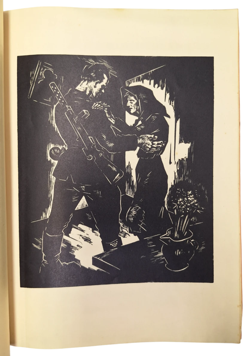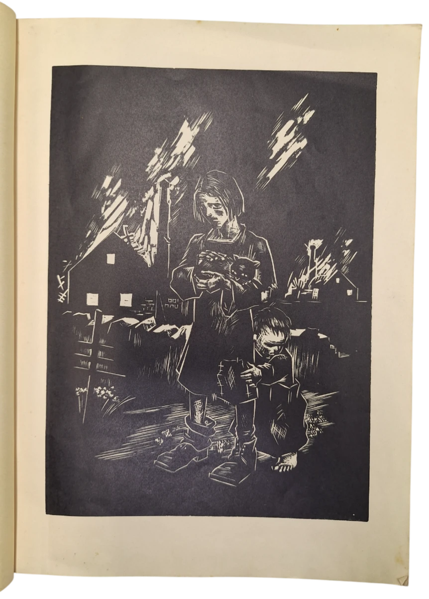 Naslovna stranica je crno-narančasta, potom naizmjenice 13 bijelih stranica i 13 originalnih linoreza.